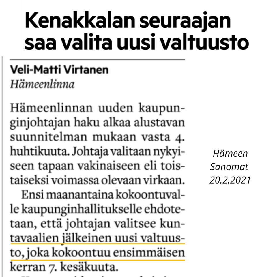 Kenakkala tyrmäsi ajatuksen Hämeen Sanomissa 9.3.2021 ja saman jutun mukaan kaupunginhallituksen puheenjohtaja Sari Rautio (kok.) ja valtuuston puheenjohtaja Sari Myllykangas (sd.) ilmoittivat halustaan pitää kiinni aikataulusta, jonka mukaan kaupunginjohtajavalinta tuodaan valtuustoon 7.6.2021, vaikka Hämeen Sanomien 20.2.2021 mukaan puhe on ollut, että valinnan tekee uusi valtuusto: