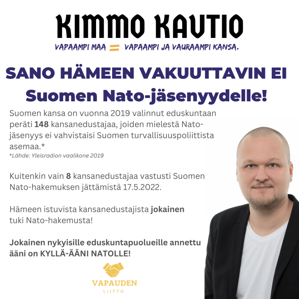Haluan vaalia Suomen pitkäaikaista ja arvokasta puolueettomuuspolitiikan ja rauhanvälitystyön perintöä. Yksikään eduskuntapuolue ei ole tällainen vastavoima, sillä kaikki eduskuntapuolueet ja käytännössä koko eduskunta kahdeksaa Nato-hakemusta vastaan äänestänyttä kansanedustajaa lukuunottamatta käänsi takkinsa Nato-kysymyksessä.